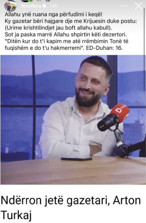 Nisur nga ky postim, Fero shkroi se gazetari “bëri hajgare me Krijuesin” dhe la të nënkuptuar se e meritonte vdekjen.