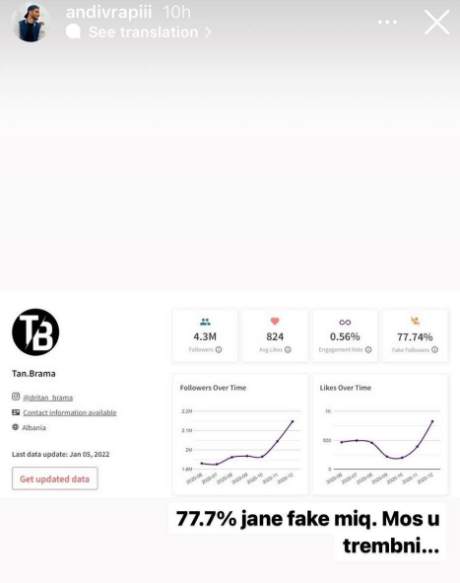 Ndërsa në një postim të gazetarit, Andi Vrapi, shihet se ndjekësit e koreografit janë më shumë se gjysma fals, pasi në fotografinë e publikuar shkruan se 77% janë fals.