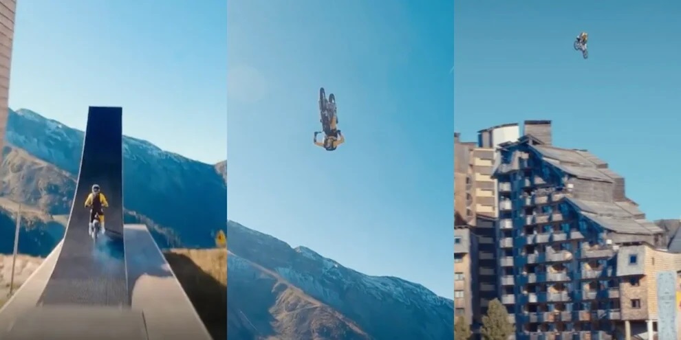 Ylli francez 36-vjeçar i motocros-it në stilin e lirë e kreu këtë ushtrim të çmendur dhe shumë të guximshëm në Avoriaz, një qytet i vendosur në alpet franceze. Pages u hodh nga një trampolinë e madhe e ndërtuar nga Red Bull mbi një shkëmb, hipur në bordin e "Honda FMX".