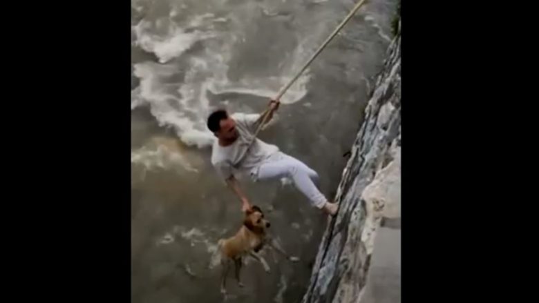 Sipas një videoje që po qarkullon në rrjete sociale, qytetari ishte i lidhur me një litar në trup derisa futej në shtratin e lumit dhe e kap qenin.