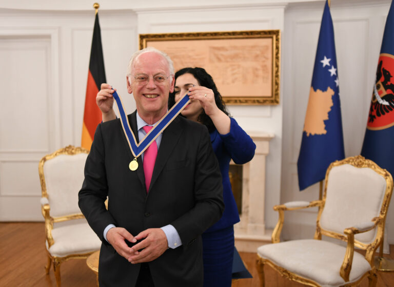 Presidentja Osmani njoftohet se theksuar që dekorimi i ish-ministrit gjerman përkon me 23 vjetorin e çlirimit të Kosovës, për të cilën ai ishte meritor.
