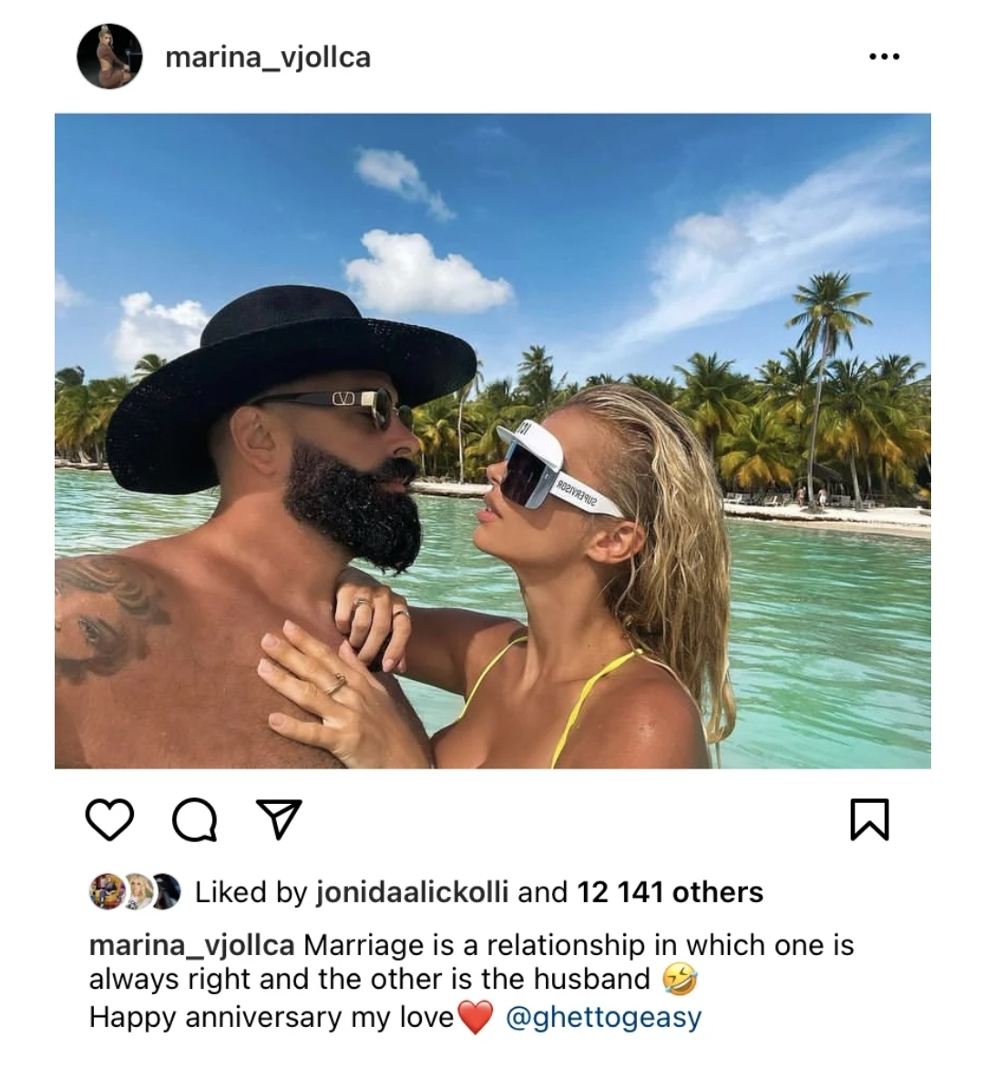 Ajo ka bërë një dedikim dhe ka zbuluar një sekret të familjes së saj. “Martesa është një marrëdhënie ku njëra ka gjithmonë të drejtë dhe tjetri është burri! Gëzuar përvjetorin dashuri” shkruan Marina.