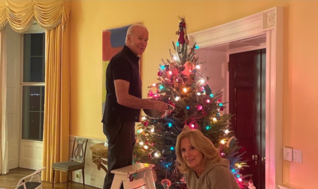 Biden ka shpërndarë në Twitter një foto familjare nga momenti kur ndihmon të zonjën e Shtëpisë së Bradhë, Jill Biden, në përpilimet e fundit për dekorimin e bredhit të Krishtlindjes.
