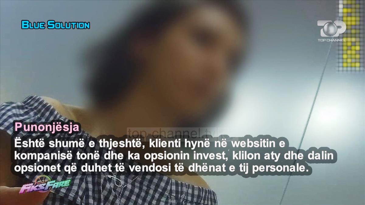 Kompania tjetër ku gazetarja e Fiksit u paraqit është Blue Solution. Edhe kjo kompani operon në fushën e investimeve online në bursë me investime në euro, dollarë, në kriptomonedha, bitcoine, flori në çdo gjë të mundëshme. Në këtë call center punohet në disa gjuhë si spanjisht, italisht, anglisht dhe gjermanisht me kapacitet punonjësish diku tek 20 persona. Punonjësja i shpjegon gazetares se detyra e saj do jetë të bindi klientin që të zgjedhi platformën e tyre dhe jo platformat e tjera. Depozita e parë që quhet FTD minimumi që mund të investojë një klient është 250 euro, maksimum nuk ka. ” Janë mashtrime! Thjeshtë klienti duhet të depozitojë, por për të fituar nuk fiton asnjëherë” tekson punonësja. Më pas ajo i shpjegon gazetares se e rëndësishme është të bëj sa me shumë FTD. Rroga bazë në këtë call center është 400 euro neto, dhe nga një deri në 3 kontrata në muaj paguhet 40 euro ekstra secila prej tyre. Nëse arritet që brenda muajit të bëhen 10 FTD atëherë ato paguhen 100 euro secila.
