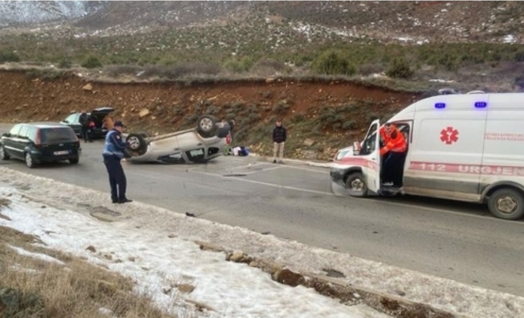 Në pamje shihet se njëri prej automjeteve është përmbysur pas përplasjes së fuqishme./albeu.com