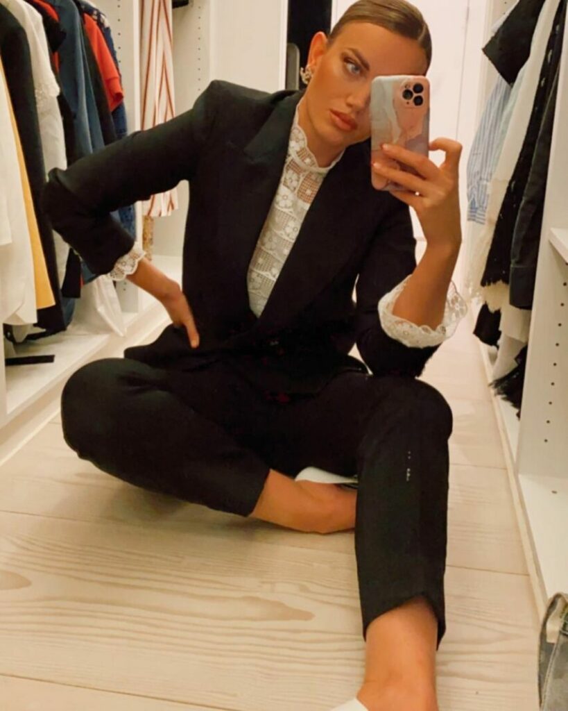 Ajo është e veshur me një komplet të veshjeve të zeza derisa bën selfie në gardërobën e saj.