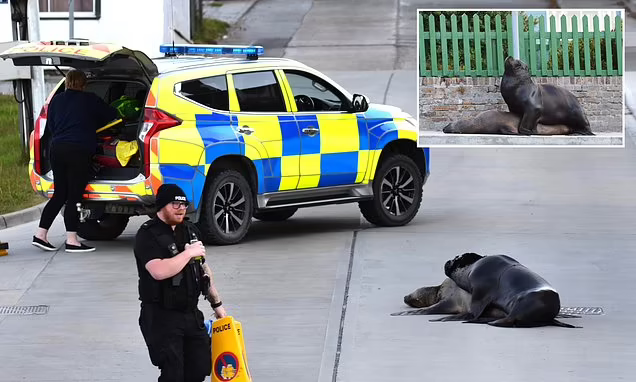 Imazhet qesharake tregojnë konët rrugorë që policia vendosi për të rrethuar vendin e mbrojtjes së luanëve të detit, të cilët kishin dalë nga një gardh metali duke kaluar në trotuar.